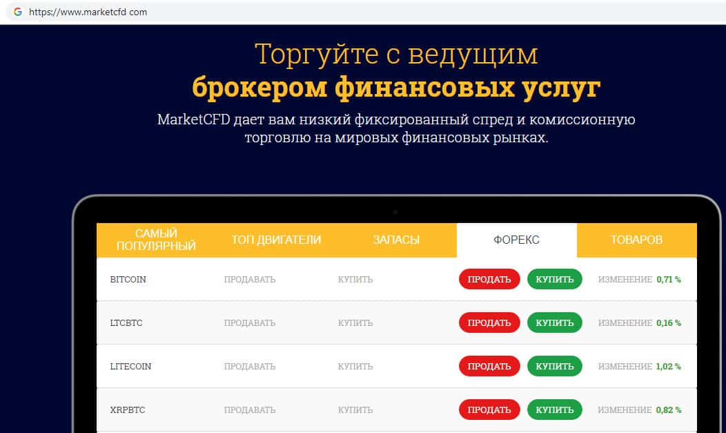 Мошенники компании MarketCFD утверждают, что необходимо начать торговать прямо здесь и сейчас и именно на их официальном сайте. Жулики из Маркет ЦФД предлагают пользователям торговлю различными валютными парами, а также криптовалютами. Таким образом создавая иллюзию того, что брокер MarketCFD настоящий.