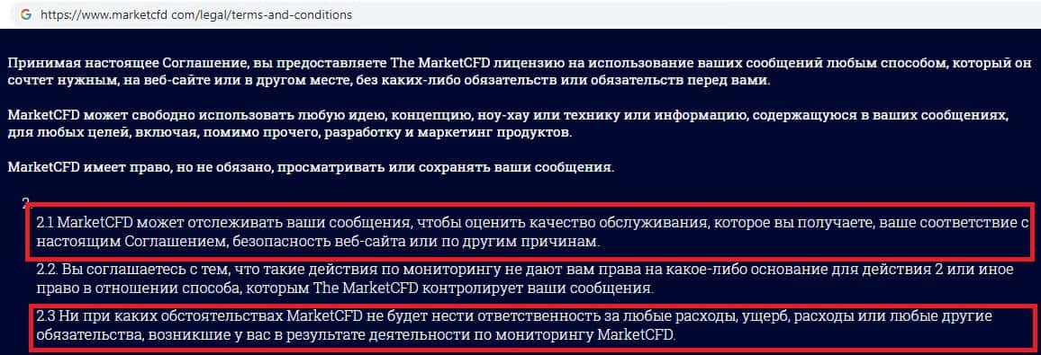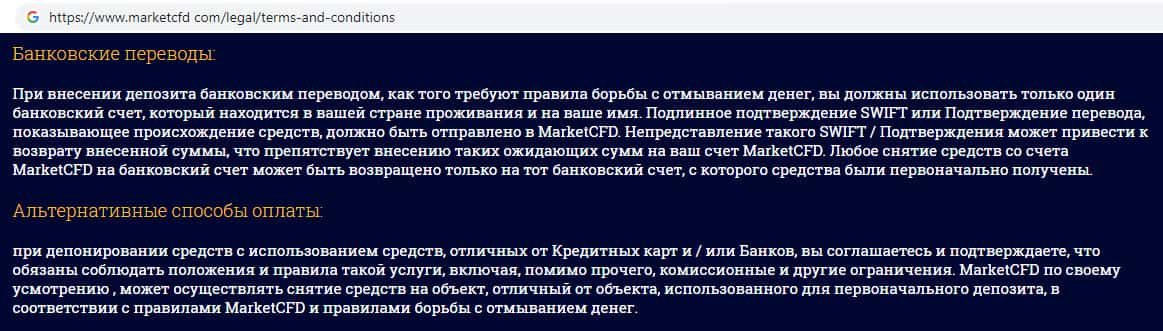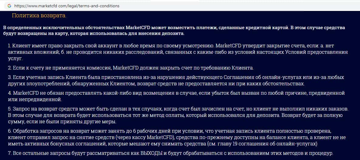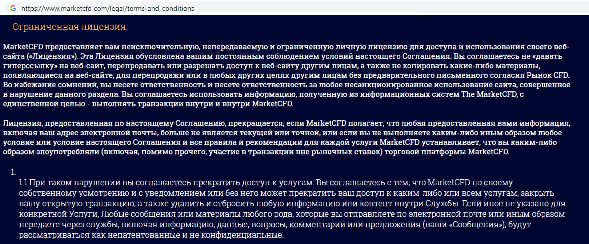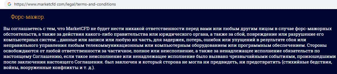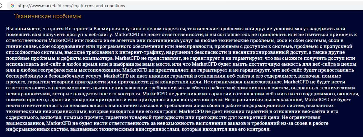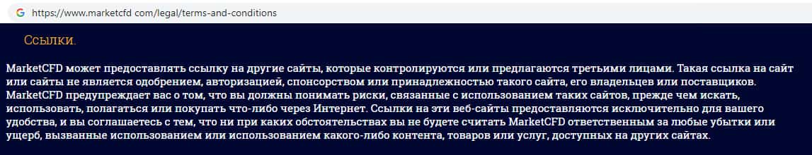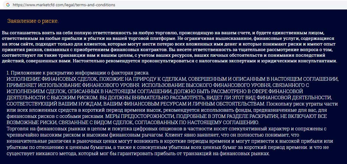 - Условия пользования сайтом мошеннической организации MarketCFD