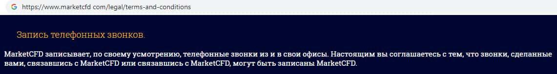 Компания MarketCFD ведет запись всех телефонных звонков, предупреждая об этом пользователей. Тем самым мошенники конторы Маркет ЦФД пытаются создать иллюзию того, какая честная их компания. Поэтому мы не рекомендуем связываться с данным скам-брокером.