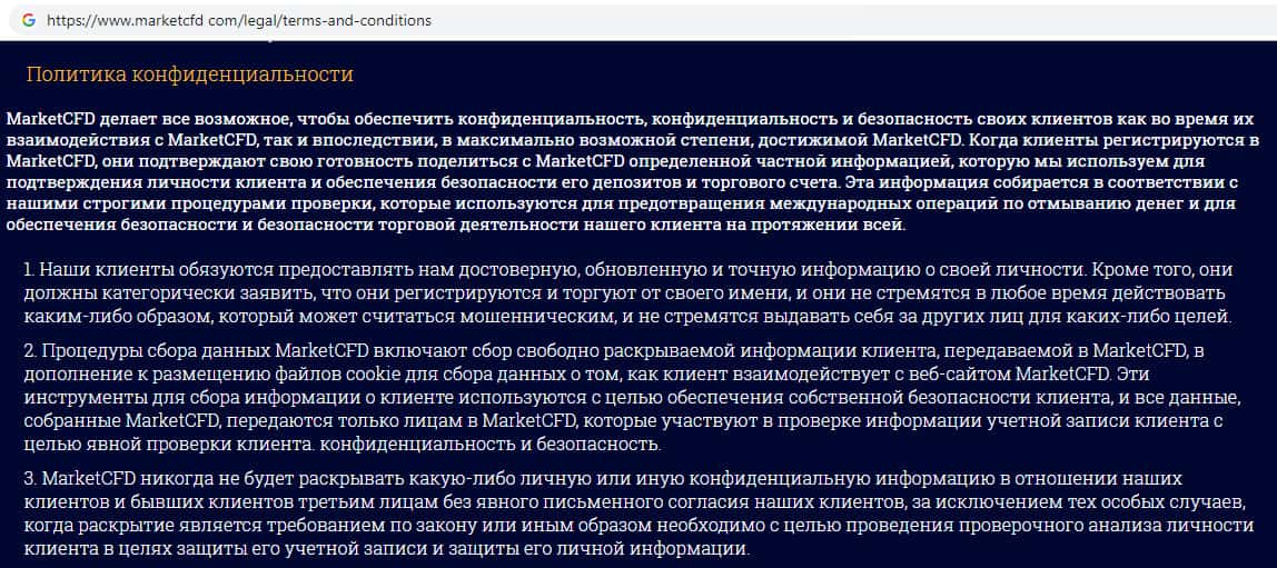 - Политика конфиденциальности на сайте скам-брокера Маркет ЦФД