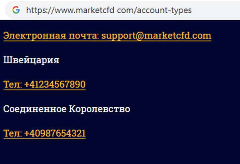 Основными номерами телефона по которым можно связаться с шуллерами MarketCFD, является номер телефона Швейцарии и Соединенных Штатов Америки. Из этого можно сделать вывод, что менеджеры скам-организации Маркет ЦФД разговаривают с клиентами исключительно на английском языке.