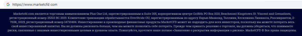 Данный интернет-лохотрон под названием Маркет ЦФД принадлежит юридическому лицу, находящемуся в одном из оффшоров на острове Сент-Винсент, где зарегистрировано немалое количество подобных жульнических организаций. Скам-брокер не имеет права предоставлять свои брокерские услуги на территории Российской Федерации.