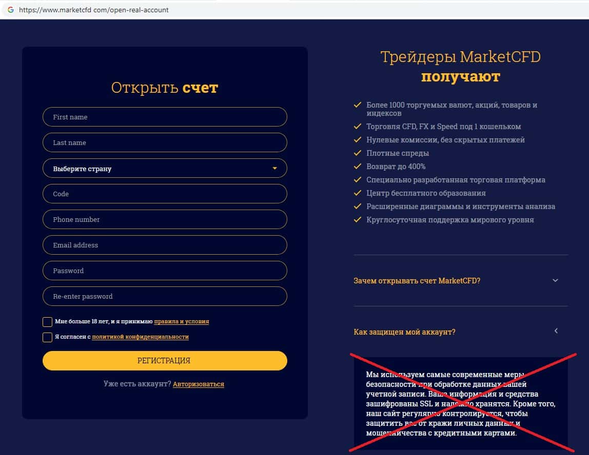 Скам-организация MarketCFD на своем официальном сайте ведет сбор данных о клиенте предоставляя для этого бланк, в котором для регистрации необходимо указать первоначальные данные. Здесь же шуллера из Маркет ЦФД рассказывают клиентам сказки о том, что используют самые современные меры безопасности при обработке Ваших данных.