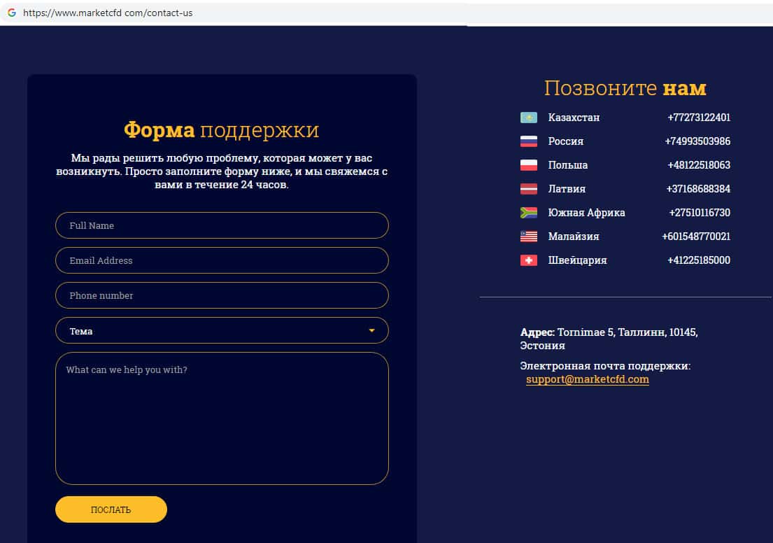 Аферисты на своем официальном сайте указывают информацию о том, что главный офис скам-конторы Маркет ЦФД находится якобы в Эстонии. Так же шуллера компании MarketCFD предоставляют целый список номеров телефона для многих стран и конечно же адрес электронной почты своей организации, которые указаны ниже: