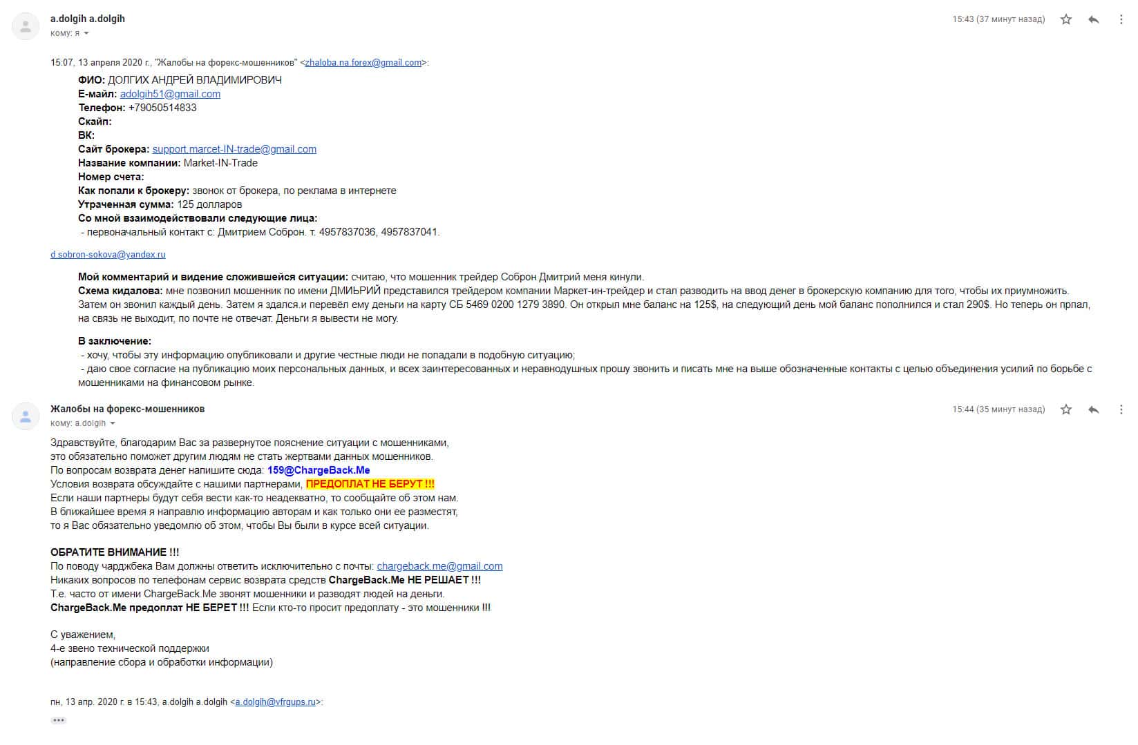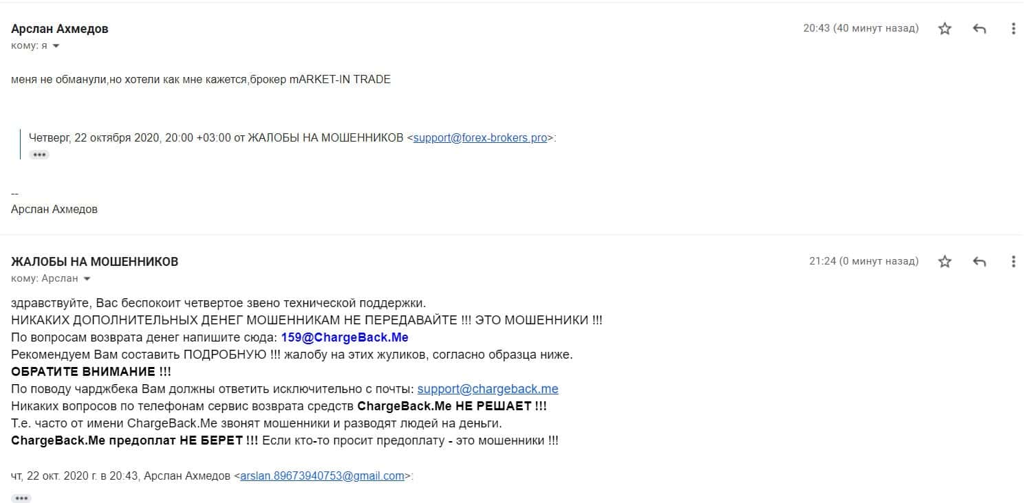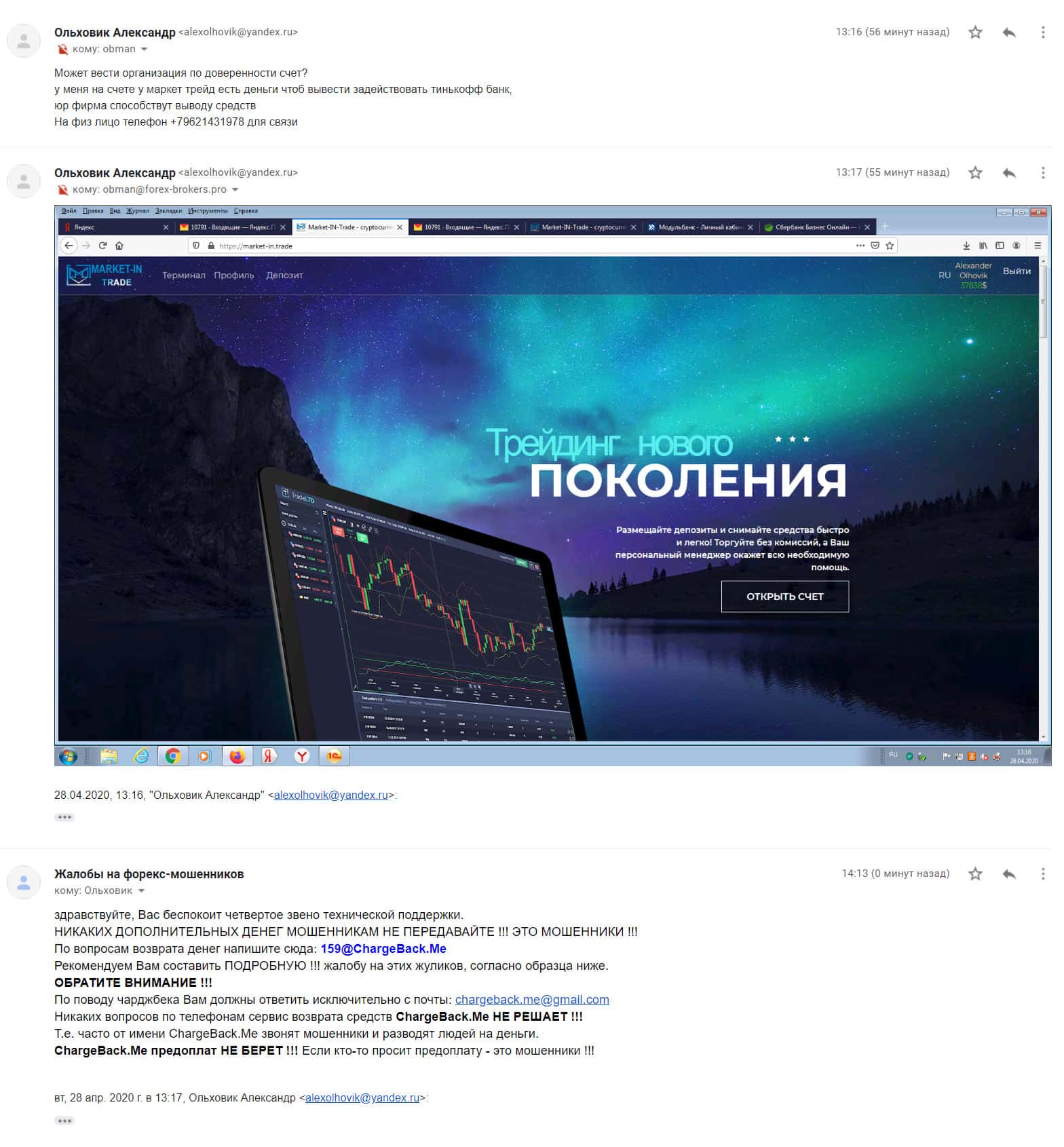 Скаммеры в лице дилингового центра Market-In Trade облапошили одного из свои клиентов на 300 тысяч рублей, обо всем произошедшем в данной мошеннической организации автор сей жалобы сообщил на емайл интернет-сервиса, разоблачающего деятельность фальшивых брокеров, а также разных онлайн-лохотронов в виде хайп-проектов.