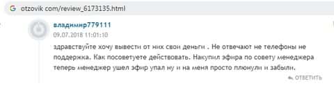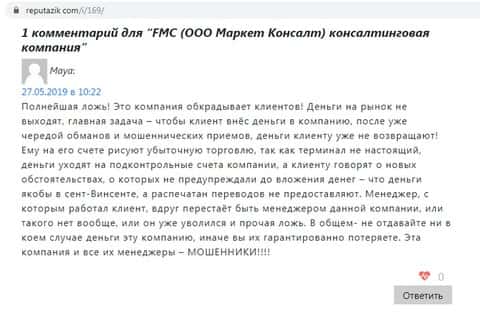 Сотрудничество с Маркет Консалт закончилось плачевно и для этого клиента, судя по его комментарию на отзовик ком. Махинаторы действовали стандартно - после того, как мужчина внес сумму на счет, его деньги слили и перестали отвечать на звонки и письма.
