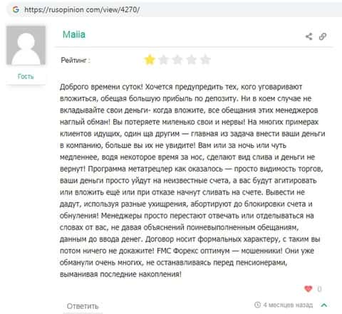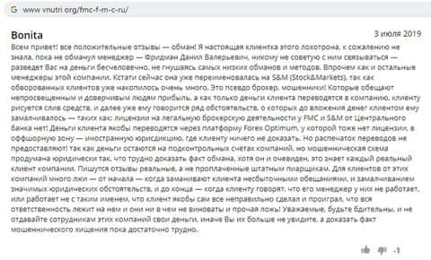 О том, как мошенники из F-M-C обкрадывают клиентов узнаем из комментария возмущенной клиентки. Оказывается, жулики обманом выманивают деньги якобы для форекс торговли и получения прибыли, а на самом деле тупо сливают все средства жертвы себе на счет.