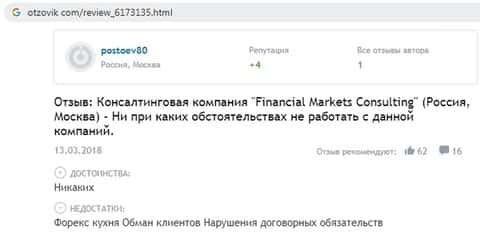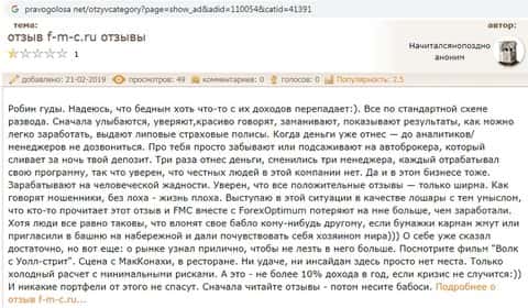 Бывший клиент жуликов F-M-C, как и подобные ему жертвы, безоговорочно верил, что брокер поможет ему приумножить его вложения. Целых 3 раза носил мужчина деньги в данную шарагу. Только оставшись с пустым кошельком и не дозвонившись до менеджеров, он понял, что его кинули.