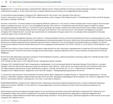 Отзыв на зоон ру о неслабом попадалове на махинации от Маркет Консалт на 8 с половиной штукарей зелени. Мужчина в течение долгого времени безуспешно пытается вывести свою инвестицию, однако мошенники сначала всячески затягивали процесс, а затем просто сменили адрес и исчезли.