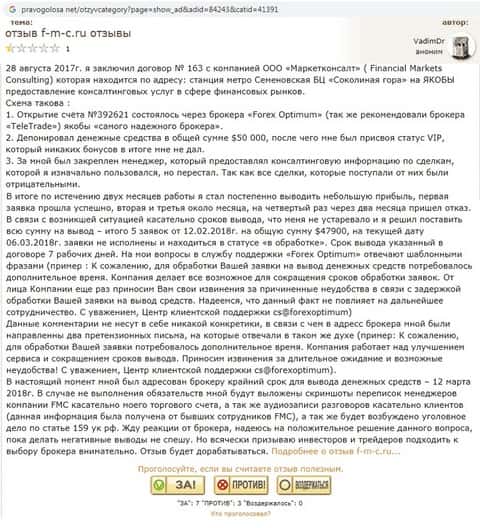 Клиентка шарашки F-M-C описывает, как мошенникам удалось надуть ее на 12 штук зеленых. Под уговорами работников конторы она внесла 14885 долларов, а затем еще 12000, ожидая несметной прибыли с этих денег. В итоге ее моментально надули на 12 штук и не выводят остальную сумму.