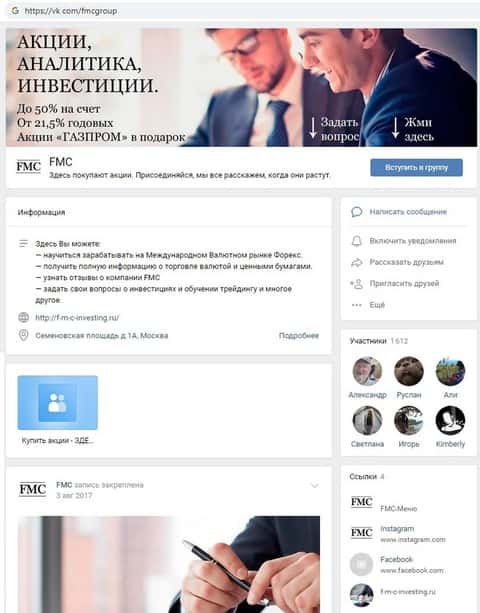Что касается группы F-M-C в vk com, создается ощущение, что она полностью заброшена. Последняя запись датируется аж 2017 годом. По всей видимости, у жулья и без того хватает клиентов, которых нужно постоянно обрабатывать и сбивать бабло.
