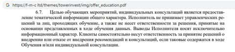 Ниже видим цель, которая прописана во втором договоре-оферте F-M-C на оказание услуг по обучению. Это лишь предоставление теоретической информации общего характера. Никаких денежных отношений с клиентами. Как же тогда объяснить сотни облапошенных ими жертв?
