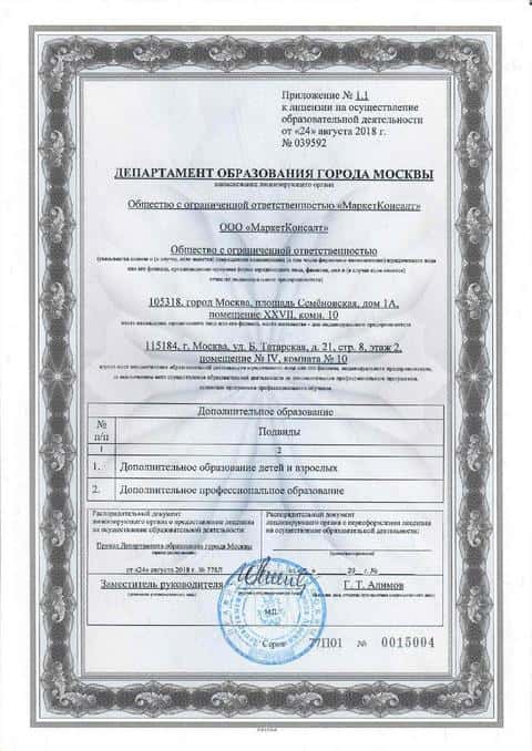 Приложение к лицензии лохотронщиков Маркет Консалт конкретно оглашает, что им разрешено делать - учить детей и взрослых и давать дополнительное образование. Заниматься брокерской деятельностью и облапошивать людей, выдавая себя за брокеров, права им никто не давал.