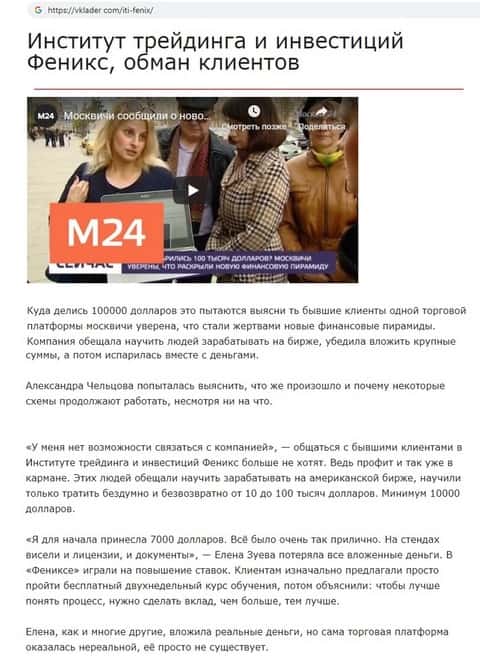 Выясняется, что руководитель F-M-C является директором еще одной компании - так называемого, института трейдинга и инвестиций Феникс. Что это за контора выявляет первый же поисковый запрос в интернете: шайка обманщиков, кинувшая тысячи москвичей на сотни тысяч долларов.