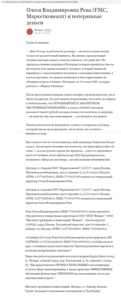 Еще один негативный отзыв на руководителя шарашки F-M-C. Женщина описала, как отдала все деньги, полученные от продажи квартиры в Болгарии мошенникам. Договор подписала сама директор компании - Рева О. В., являющаяся руководителем и других пирамид в сети.