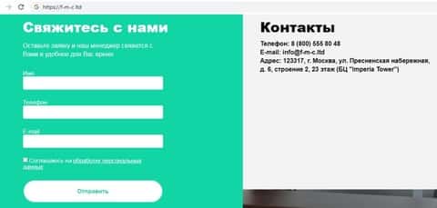 Связаться с шарашкиной конторой F-M-C можно по их адресам или телефону, которые указаны в разделе Контакты на портале. Также можно оставить заявку их менеджеру, который незамедлительно созвонится с возможной будущей жертвой лохотрона и расскажет о выгодных вложениях. Запомните контакты Маркет Консалт: