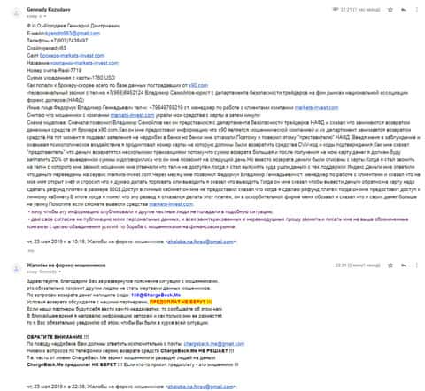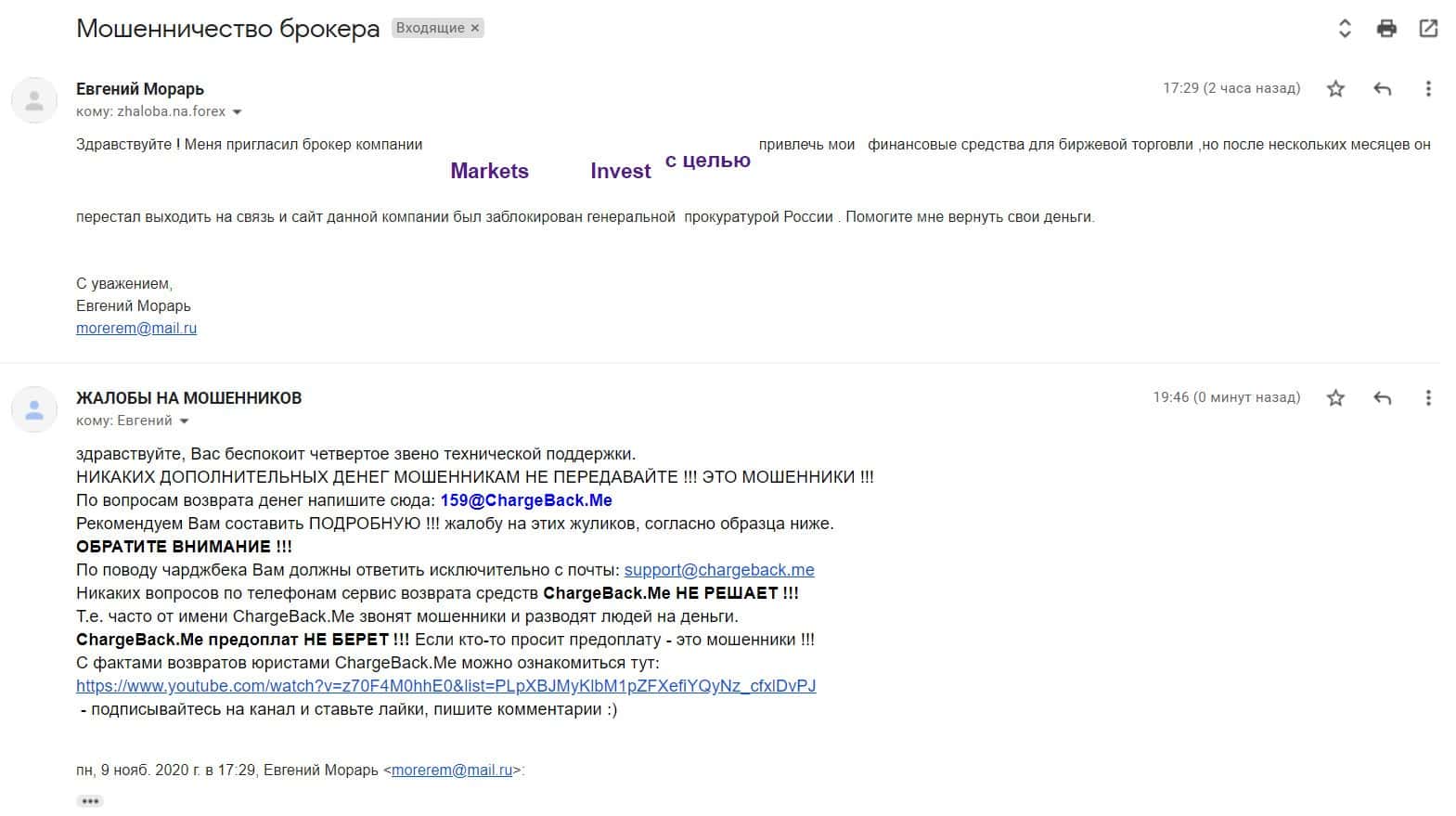 Следующая жалоба ведает о жульничествах в таких брокерских кухнях как scam-конторы Маркетс Инвест, Икс90 и 10Брокерс. Для того, чтобы попытаться вернуть утраченные деньги, человеку просто необходимо обратиться в специализированную службу ChargeBack.Me за помощью.