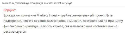 По словам данной статьи, контора Markets Invest это крайне сомнительный проект, на которого есть подозрения, что работает вся система как хайп на основе принципов финансовой пирамиды. В связи с этим, автор статьи крайне настоятельно не рекомендует связываться с мошенниками Маркетс Инвест.
