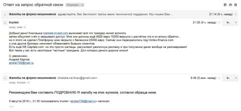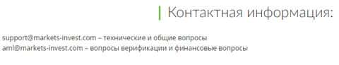 А вот чтобы связаться с мошенниками, которые украли у вас деньги, аферисты Markets Invest предоставляют только два почтовых ящика, что бы, в случае воровства, жертва не доставала своими звонками. Таким образом они освободили себя от лишней суеты. Почты для связи: