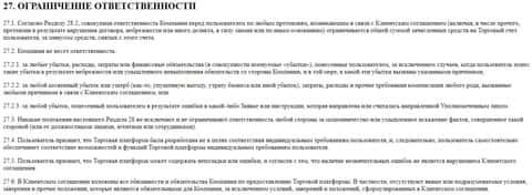 Рассмотрев, на первый взгляд, грамотно составленный договор, который предоставляет контора Маркетс Инвест на подписание своим клиентам, можно найти такой раздел, как Ограничение ответственности. В нем контора полностью указывает, что она не несет ответственность за потерю денег клиентом.