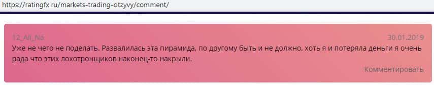 В связи с довольно наглой мошеннической и противозаконной деятельностью жуликов Маркетс Трейдинг на просторах сети интернет полно негативных отзывов пользователей об аферистах Markets Trading, один из которых об проходимцах Маркетс Трейдинг вы можете наглядно увидеть непосредственно на изображении, расположенном ниже.