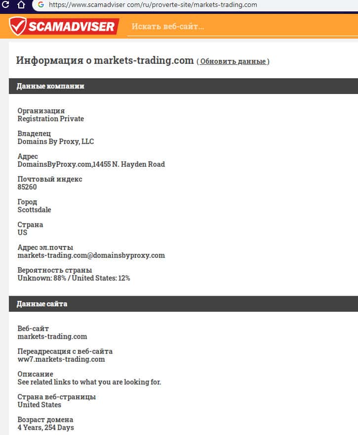 scamadviser com - сайт с технической информацией о жуликах Markets Trading