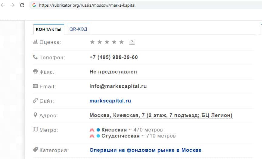Мошенническая организация Маркс Капитал успела удалить за собой всю информация перед тем как слиться с деньгами инвесторов, но нам удалось найти контактные данные кидал. Это являлось номером телефона, адресом электронной почты и адресом офиса. Жулики по какой то причине не смогли удалить это, но это всё равно ничего не меняет, контакты давно не активны.