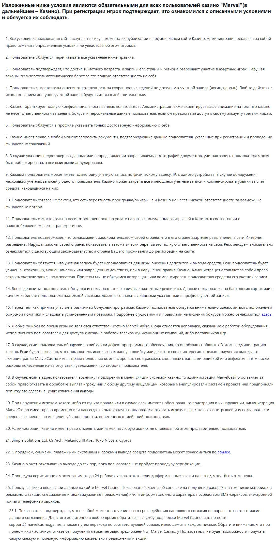 Ниже вы можете ознакомиться с полной версией договора жуликов Марвел Казино, который и будет регулировать ваши взаимоотношения с ними.