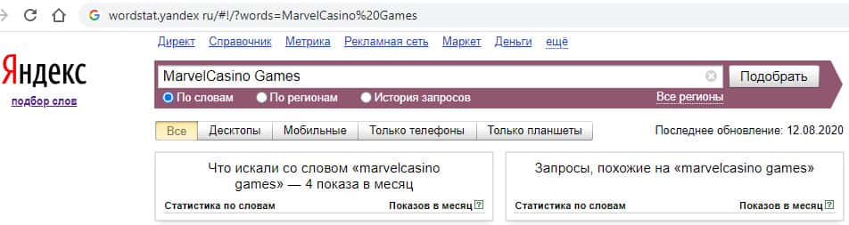 По первому запросу на английском языке "MarvelCasino Games" количество запросов в яндексе равняется 4 раза.
