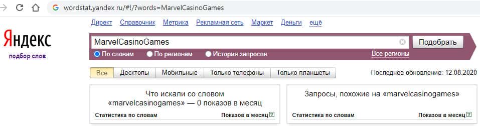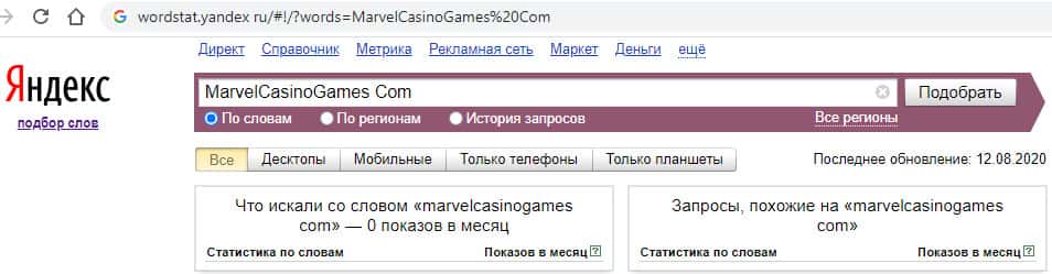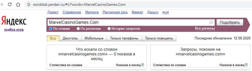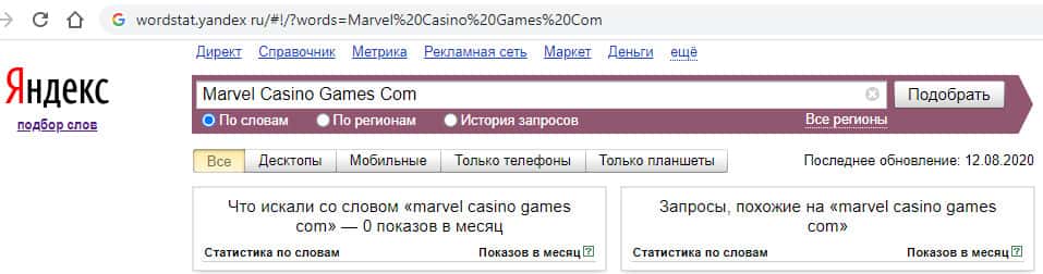И последний запрос в яндексе "Marvel Casino Games Com" без точек с пробелами показывает нам количество запросов - 0.