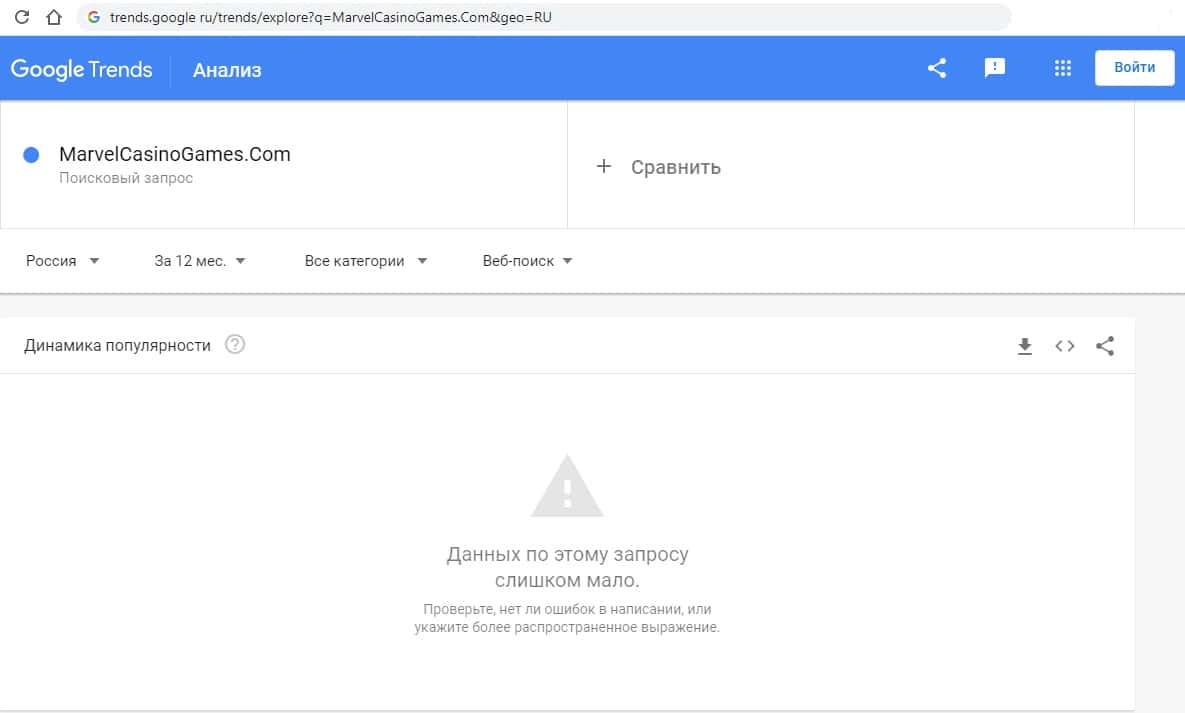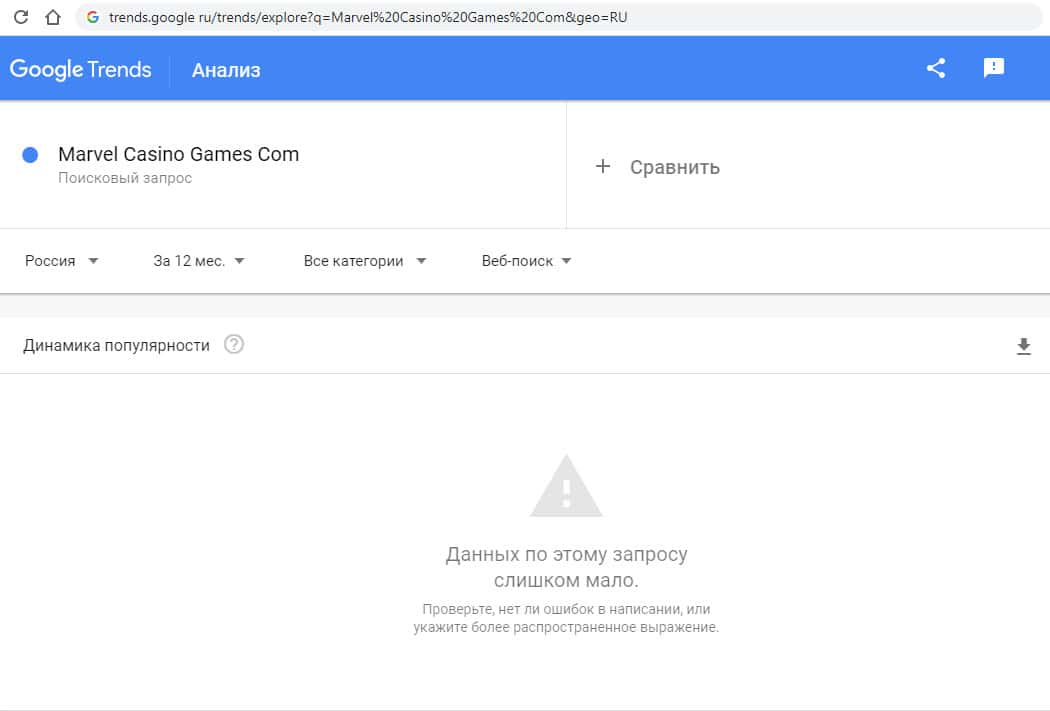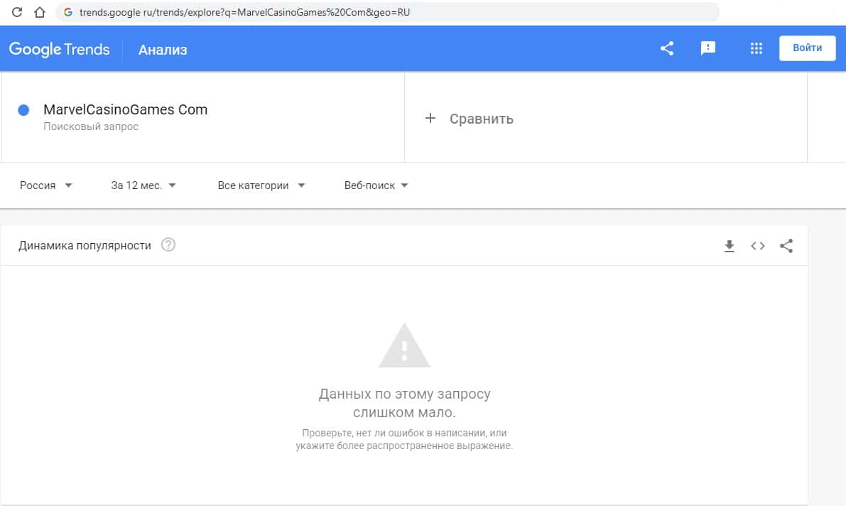 Такую же картину мы видим по запросу на английском языке "MarvelCasinoGames.Com" с точкой. Информации никто не ищет.