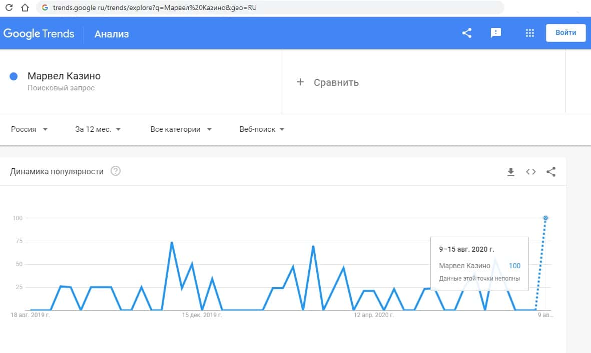 Первый запрос в Google на русском языке показывает, что количество показов по "Марвел Казино" равно 100 раз.