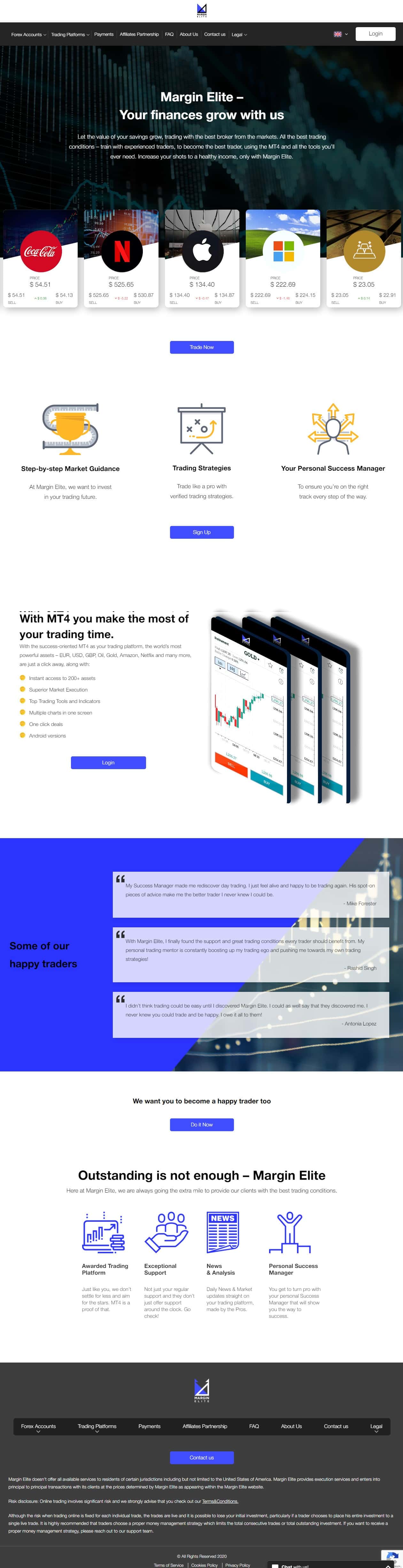 Главная страница сайта мошенников MarginElite выглядит типичной для таких лохотронов: минимум полезной информации для клиента и заурядный дизайн.