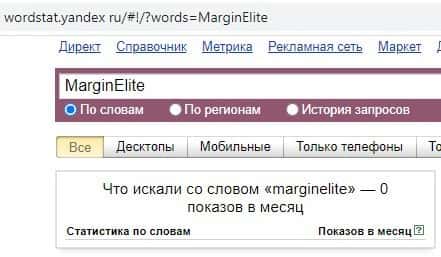 Первый запрос в яндексе на английском языке без пробела MarginElite выдает результат в 0 показов в месяц. По такому запросу информацию о мошенниках никто в сети не ищет.