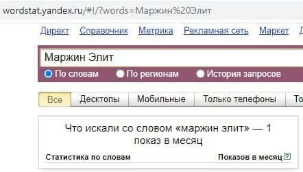 Второй запрос в яндексе на русском языке с одним пробелом "Маржин Элит" выдает результат в 1 показ в месяц.