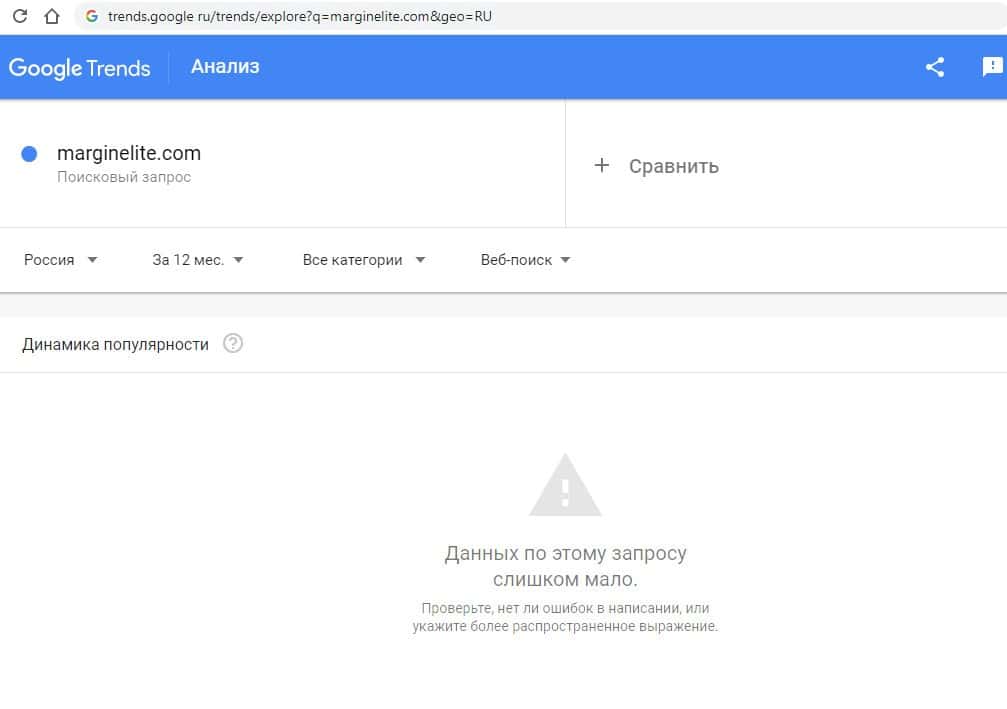 Последний запрос в Гугл на английском языке с точкой "marginelite.com" выдает точно такой же результат, как и в предыдущих 2 случаях - 0 показов в месяц.