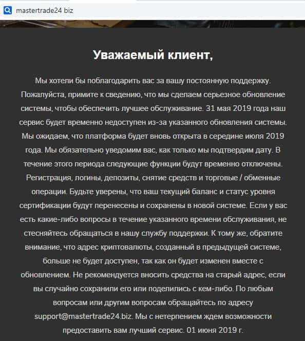 Администрация жульнической компании MasterTrade24 Biz разместила на своем сайте объявление о временной недоступности в связи с модернизацией и обновлением системы. Но ничего не бывает более постоянного, чем временное, сайт до сих пор пустой, и кроме упомянутого объявления на нем ничего больше найти нельзя, видимо это какая-то схема присвоения денег и ухода от ответственности.