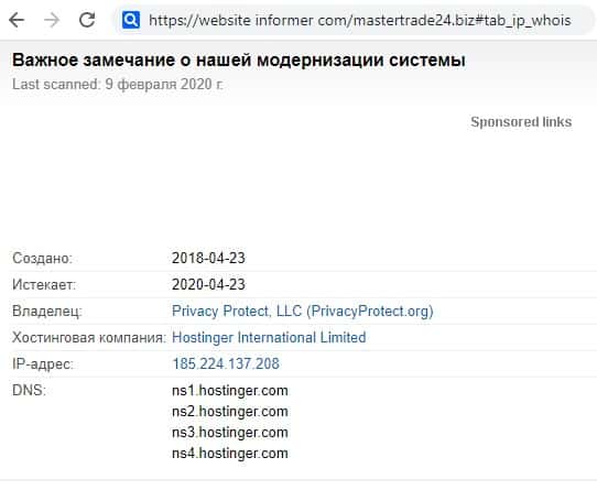 По данным с информационно-аналитического интернет-портала website informer com удалось выяснить, что срок действия официального сайта мошеннической компании Мастер Трейд 24 истекает в апреле 2020 года, хотя он и так уже целый год закрыт на модернизацию. Больше никакой значимой информации об этом сомнительном веб-сайте выяснить не удалось.