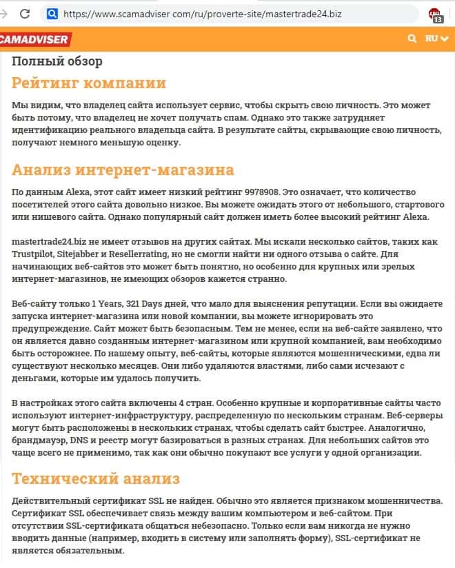 Согласно выводам экспертов с интернет-портала scamadviser com официальный сайт компании Мастер Трейд 24 обладает признаками мошенничества: владелец скрывает свою личность, веб-ресурс MasterTrade24 Biz имеет низкий рейтинг и не имеет отзывов на других сайтах, что кажется странным, действительный сертификат SSL не представлен, а это может быть небезопасно.