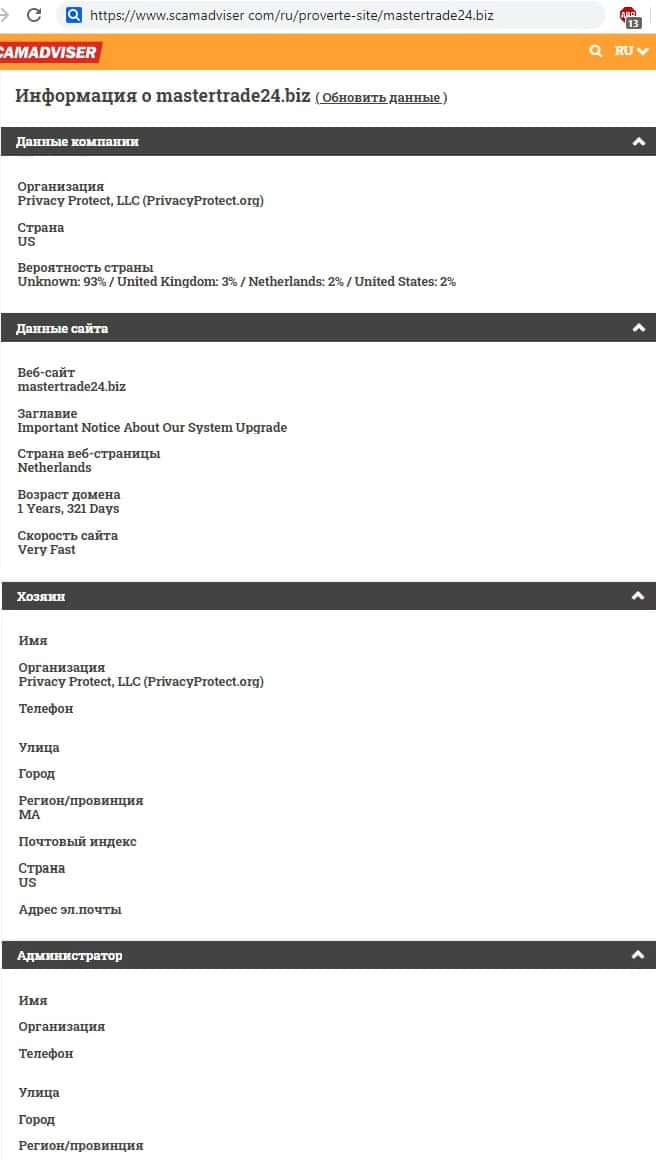 Информация, полученная специалистами информационно-аналитического интернет канала scamadviser com, об официальном веб-ресурсе брокерской конторы MasterTrade24 Biz немногословна: можно узнать только название управляющей организации - Privacy Protect LLC, страну местонахождения – США, с низкой долей вероятности, место регистрации веб-страницы – Нидерланды, и больше ничего.
