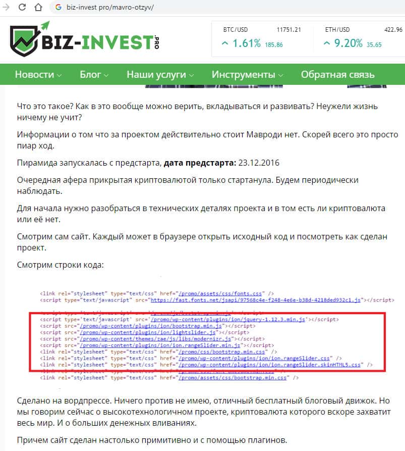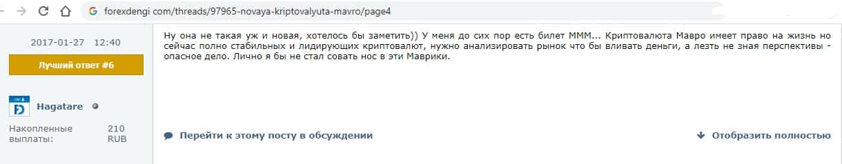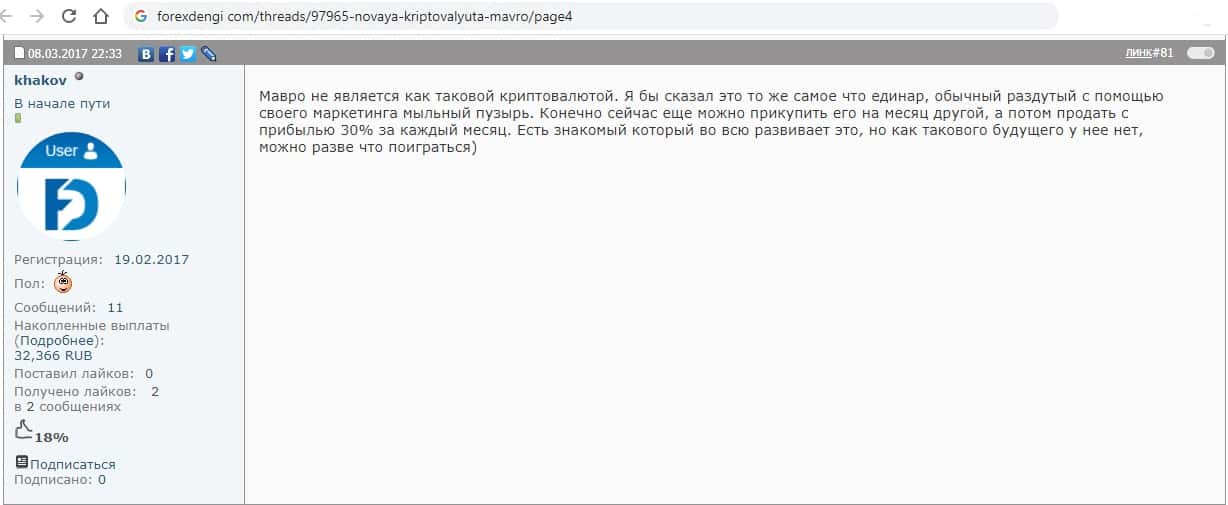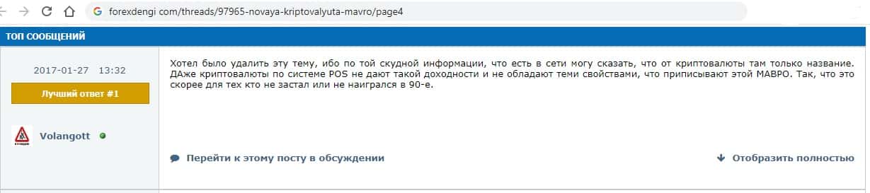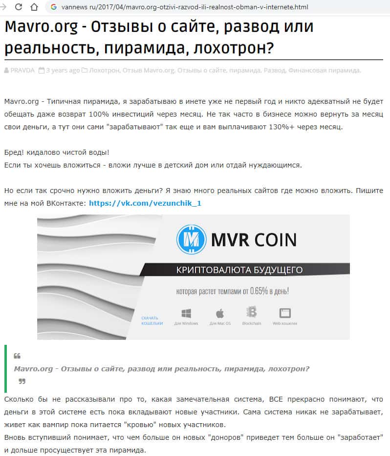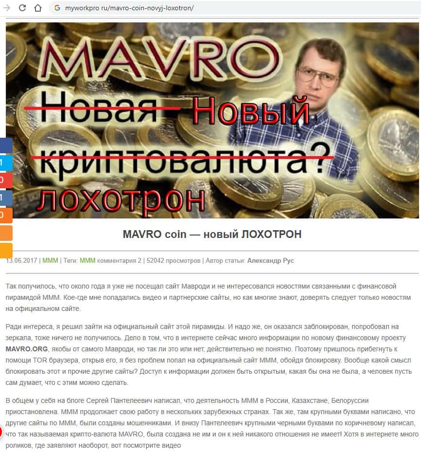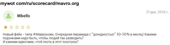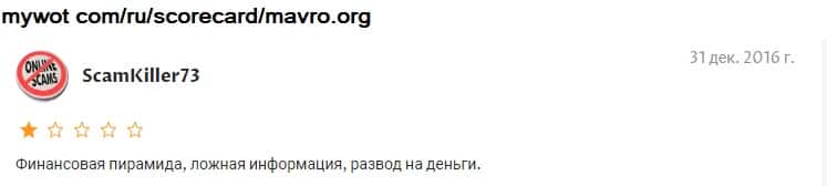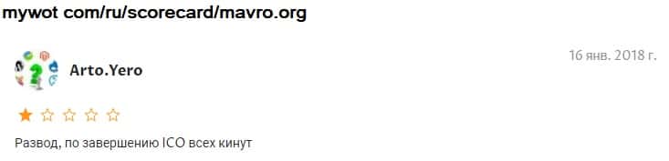 На первом же авторитетном ресурсе говорят прямо, что Мавро - это не какая ни криптовалюта, а обычный лохотрон, с которым просто нельзя связываться.