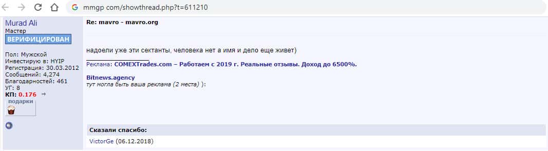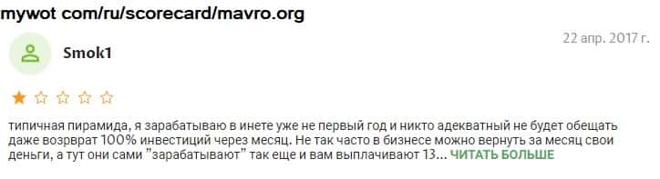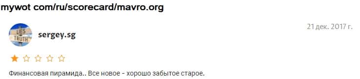 Еще один авторитетный ресурс прямо говорит о том, что Mavro Org - это типичный лохотрон, как и все, что создается под именем Мавроди. Ресурсу нельзя доверять.