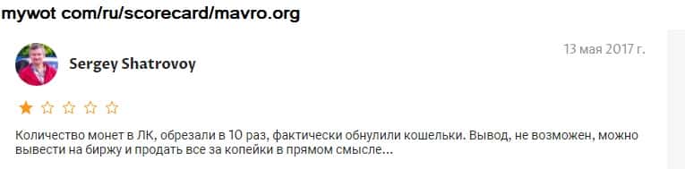 Клиенту Мавро сразу обрезали монеты в личном кабинете в 10 раз. да еще и вывести деньги невозможно, только продать на бирже монеты за копейки.