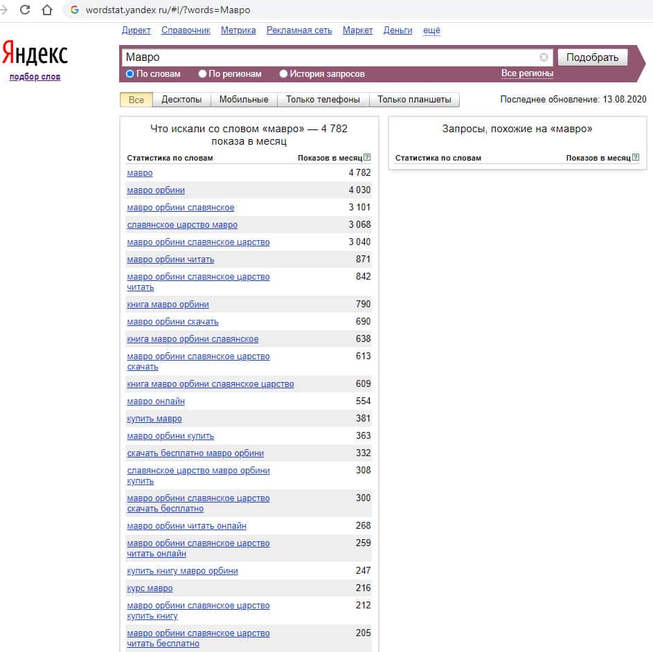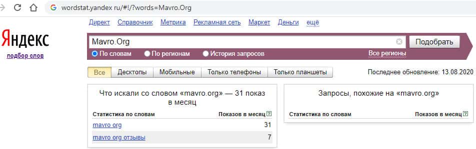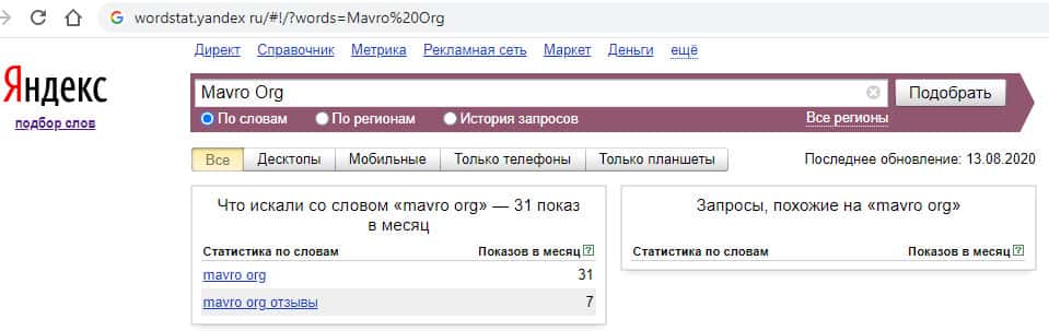 По первому запросу на английском языке "Mavro Org" показывает, что запросов в Яндекс выдает 31 в месяц.