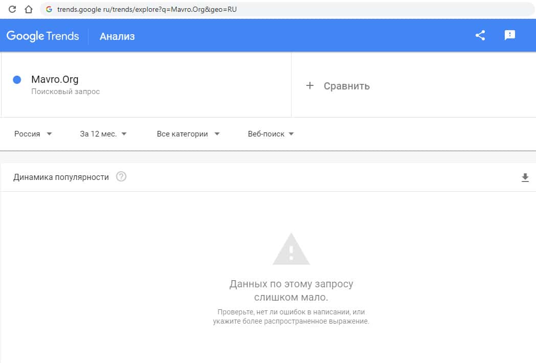 Совсем другая ситуация по запросам в гугл на русском языке "Мавро". Тут количество запросов составляет 77 раз. Это внушительная цифра.