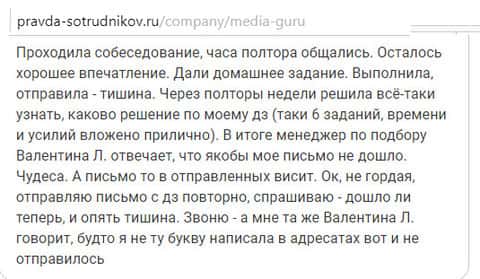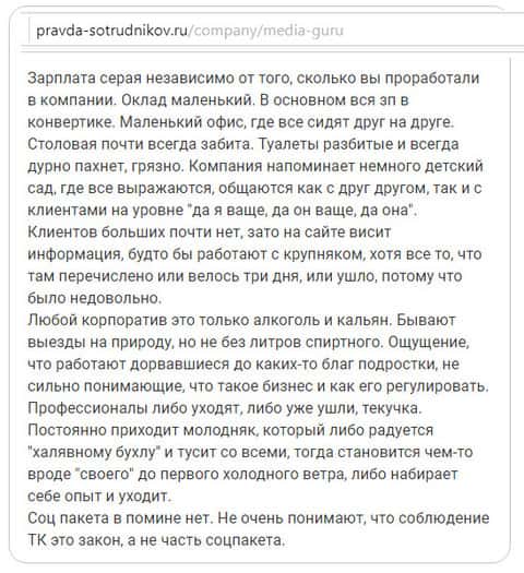 Отзыв опубликованный далее ведает об отношении персонала конторы МедиаГуру к тем, кто пытается присоединится к ним. Автор публикации заявила о том, что она, при попытке трудоустроится в MediaGuru, столкнулась с неадекватностью представителей отдела кадров лохо-фирмы МедиаГуру.