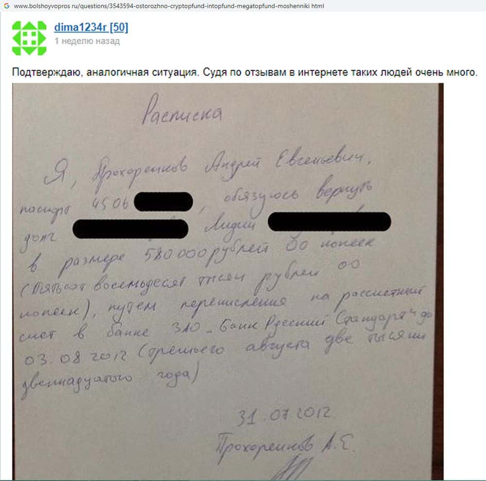 Не важно, насколько вы хорошо чувствуете биржу, с проектом Мега Топ Фонд вы не заработаете ни копейки. Жулики сразу же кладут депозит в карман. Они не платят и не собираются этого делать, а при судебных разбирательствах пытаются отмазаться... расписками на тетрадном листе. Один из трейдеров на ресурсе bolshoyvopros ru рассказал об этом.