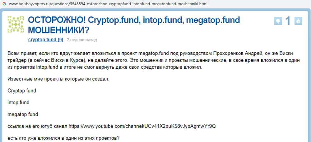 Лохотрон MegaTop Fund создан одним пронырливым типчиком, который любит ловить рыбку в мутной воде. Он уже давно пополняет свой бюджет кражами. Портал bolshoyvopros ru нашел три его проекта: Крипто Фонд, ИнТоп Фонд, который уже слился и передал эстафету Мега Топ Фонд. Причем у последних двух даже логотипы похожи как две капли воды.
