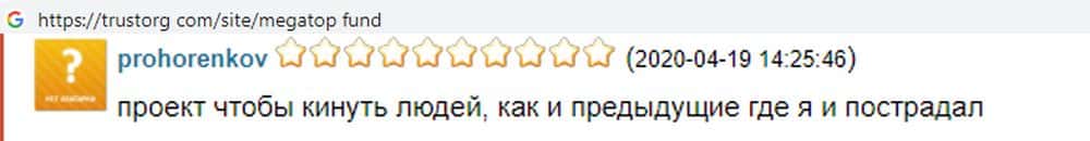 В данном разделе предлагаем ознакомится с информационным материалом в виде еще одной жалобы на мошеннический онлайн-проект МегаТоп Фонд, где клиента лишили денежных средств.