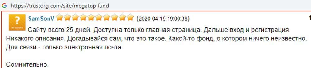 Опытного трейдера, который уже попадался на лохотроны, сложно обмануть. Но для того, чтобы раскусить, что MegaTop Fund - гнилая афера, не нужно быть инвестором, достаточно включить логику. Пользователи сайта трасторг ком так и сделали и задались вопросом, как можно вообще доверять "Мега" фонду без контактов, который существует меньше месяца.